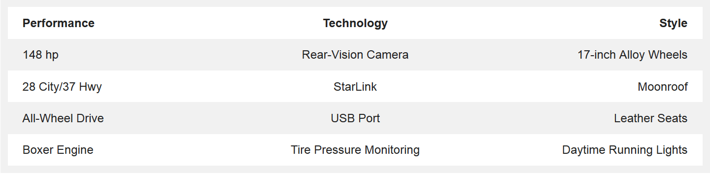 Most compact vehicles don’t offer the level of safety and capability found in the Impreza. Not only does it offer AWD, the four banger engine creates an impressive 148 horsepower and 145 lb-ft. of torque will sipping fuel at an mpg rating of 37 highway. For recent models, this all comes a rear-vision camera, power side mirrors and dual USB ports that can be used to connect an iPod or other device to the infotainment system with a 6.2-inch screen.